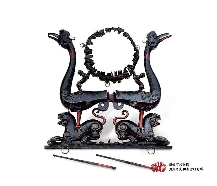 虎座鸟架鼓,器身通体髹黑漆,运用红、黄色彩绘,彰显了楚文化的浪漫与神奇。来源:湖北省博物馆